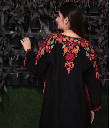 A timeless blend of traditional Kashmiri attire with intricate Aari-work, showcasing heritage charm and elegance. Perfect for all important occasions.